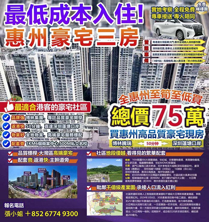 全惠州至筍至低價由75萬起 FacebookTwitterPinterestWhatsAppLinkedinReddItTumblr 最適合港客的豪宅社區– 品牌博林集團,專注品質豪宅的發展。– 來回超快,單程只需要50分鐘直達深圳蓮塘口岸。– 極高端豪宅服務標配。– 配套齊備,1KM6個商業中心,500M私立名校。報名查詢:張小姐 67749300 #惠州 #低價 #豪宅 #深圳蓮塘
